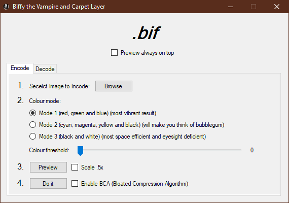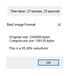 If you're not into bloating, BIF contains the option to automatically detect whether the image should be saved with BCA, for the optimal file size every time. Compression speeds are also remarkably fast; a 320x224 image takes 3 seconds, a 480x640 image takes 1 minute, and a 1920x1080 image takes a whopping 27 minutes (tested on an Intel Core i9 and AMD Ryzen 5 2500U, no background processes). So when you press that button, make yourself a cup of tea and sit back and relax, because the result will be worth every second.