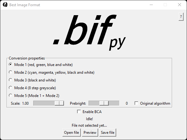 | BIF.py picks up where BIF left off, adding 2 new colour modes: Mode 4 (8 step greyscale), and Mode 5 (a combination of Mode 1 and 2). It also contains a completely rewritten GUI done in TkInter (pronounced: takinter), for full hands-on operation. |